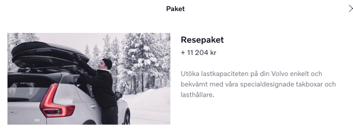 Volvo + Takbox: Genom en takbox ökar du lastutrymmet för en utrymmesutmanad skidåkande barnfamilj. Du måste inte ha den, men för många kunder ökar den värdet av helheten.