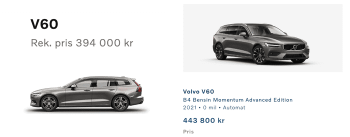V60 vs. V60 lagerbil: Istället för att vänta i sex veckor på att få din konfigurerade bil producerad, kan du välja en färdigproducerad lagerbil. Den kanske inte har helt rätt färg eller features, men den är nära nog för att du som konsument kan tänka dig att handla.